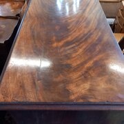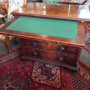 Having a well figured flame mahogany top and draw fronts and pull out brushing slide.