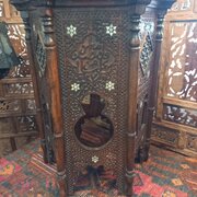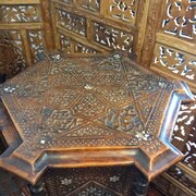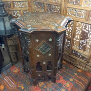 A very good antique Syrian side table. A very well made and sturdy table. This table has inlaid mother of pearl and bone decoration, Islamic script, carved open work side panels and carved wood top. There are some losses to the inlay this is very common in this style of table but it dosn't detract from the beauty of the piece. All in all a lovely table in overall good condition with good colour and patina. The dimensions are 61 cm ht x 51 dia cm dia