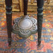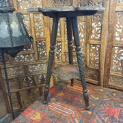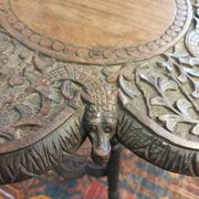A good profusely carved Anglo Indian two tier side table. The top carved with leaves and Crocodiles and a centre panel to stand a lamp or similar.in very good original condition no breaks or repairs. the dimensions are 49 cm ht x 41 cm dia